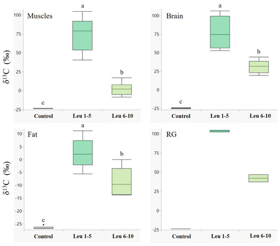 Based on personal observations on males from captive colonies, and supported by previous studies on other species of hornets [,,], we considered the first ten days post eclosion as the sexual maturation period. To examine the allocation and incorporation of the labelled nutrients during this period, newly-emerged males were fed with labelled artificial nectars (enriched with either 13C1-leucine/13C1-glucose) during either the first or last five days of the experiment. The males (N = 50) were taken from four colonies upon emergence and distributed randomly between five boxes, according to the following feeding treatments (n = 10, for each box): (1) Leu 1–5—13C1-leucine enriched nectar on days 1–5; (2) Leu 6–10—13C1-leucine enriched nectar on days 6–10; (3) Glu 1–5—13C1-glucose enriched nectar on days 1–5; (4) Glu 6–10—13C1-glucose enriched nectar on days 6–10; and (5) Control—standard (unlabeled) nectar, for ten days. The control group served as a baseline reference for the δ13C isotope analysis. Groups that received a labelled diet during the first five days were fed with the standard nectar in the following 6–10 days and vice versa. The boxes were also supplied with water ad libitum. After ten days of treatment, males were frozen at −20 °C. Next, flight muscles, brains, fat bodies, and reproductive glands (seminal vesicles and accessory glands) were dissected and removed using a stereoscope and watchmaker forceps. Abdominal tissues (i.e., fat body and reproductive glands) were carefully washed with double-distilled water to ensure there were no traces of labelled fluid originating from the digestive system. The seminal vesicles and accessory glands from each treatment were pooled from five individuals and dried together in Petri dishes to achieve the minimal dry weight for the isotope analysis (n = 2 for each of the five treatments). The rest of the tissues were placed separately in Petri dishes or Eppendorf tubes (1.5 mL) and dried in an oven at 60 °C for three days minimum. Dried muscle tissues were further treated, as mentioned above. The fat bodies of two males, one from the control and one from the Leu 6–10 group, appeared abnormal and, therefore, were excluded from the analysis (n = 9, for each of these treatments).