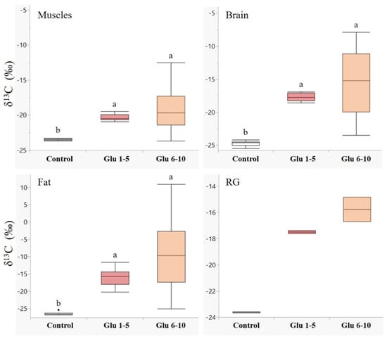 In contrast, we found that older males seem to allocate the glucose (or glucose-derived carbons) in their body tissues at a higher rate than younger males (Figure 2), indicating that during the first days after eclosion, most of the energy is channeled to supply the energy for the biosynthesis of body tissues, and only as the male matures, a metabolic shift towards glucose accumulation for energy storage occurs. The greater variability in the δ13C ratios observed in the group fed on labelled glucose on days 6–10 reflects the various metabolic pathways that glucose molecules can undergo in each tissue. Correspondingly, Panzenböck and Crailsheim (1997) found that the body glycogen in honeybee drones decreases within the first five days, then slowly but significantly increases, specifically in the thorax and head []. In active flight muscles, glycogen is rapidly broken down to provide a constant supply of glucose to fuel the mitochondria; thus, dietary nutrients can be utilized not only for developing muscle tissue but also as energy substrates for the mitochondria activity, and possibly even for maintaining the antioxidant potential to protect the muscles during the extensive aerobic activity of flight []. In the brain, most of the glycogen is allocated in the eye glial cells, providing energy for the photoreceptor cells [,]. Accordingly, males that accumulate greater glycogen stores in their flight muscles and eyes will be better equipped for the most critical phase of their lives—the long distant flights when searching for a queen to mate with. In the abdomen, while the glycogen content is high upon eclosion, the energy from dietary glucose is restored mostly as lipids in the fat body [,].