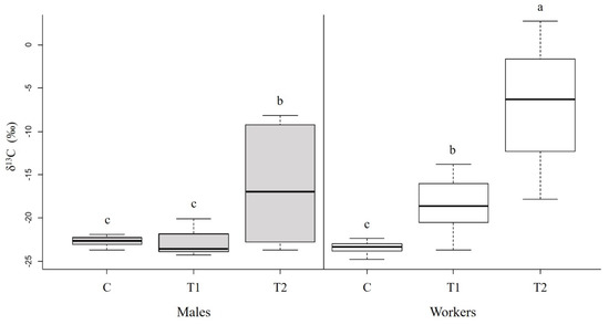 Incorporation of 13C1-leucine from dietary proteins in the flight muscles of males and workers. δ13C values (‰, median + quartiles) in muscle tissues of males (N = 34; left; gray) and workers (N = 35; right; white) following ten days on a 13C enriched protein diet in the absence (T1) or presence (T2) of larvae. Hornets fed on unlabeled protein (with and without larvae) served as controls (C). Higher delta values indicate higher 13C levels. Different letters above bars indicate significant differences between diets and castes (p < 0.05), according to Tukey post hoc pairwise comparisons. For the δ13C measurements, see Table S1.