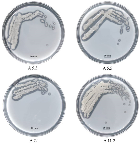 On nutrient agar after 24 h, the strains formed beige colonies, 1–2 mm in diameter with wavy edges. The cells turned out to be Gram-positive, oval, mobile, and forming spores. By sequencing and comparing the fragment of 16S rRNA gene nucleotide sequence with GenBank data, we identified the strains as bacteria of the genus Bacillus. The proteomic profiling of ribosomal proteins carried out on the Biotyper Microflex LT instrument confirmed that the studied strains belong to the genus Bacillus (Supplementary Materials Table S1). The milk agar test revealed that all the strains have a proteolytic activity (Figure 1). Clear zones around the colonies formed due to the hydrolysis of milk casein and were clearly visible on the plates. The following results on the clear zone size were obtained: A5.3, 2.9 mm; A5.5, 1.9 mm; A7.1, 1.5 mm; and A11.2, 1.8 mm.
