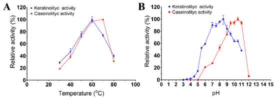 Effects of temperature (A) and pH (B) on keratinolytic and caseinolytic activities. Values shown in (A,B) (mean ± standard deviation [SD]) are representative data obtained in triplicate assays of the enzymatic extract from Bacillus sp. A5.3.