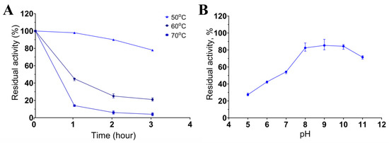 The influence of temperature (A) and pH (B) on keratinase stability. Values shown in (A,B) (mean ± standard deviation [SD]) are representative data obtained in triplicate assays of the enzymatic extract from Bacillus sp. A5.3.