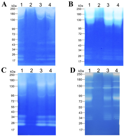 The ability of the enzymatic extract to degrade proteinaceous substrates from various classes was demonstrated on casein (Figure 5A, Supplementary Materials Figure S1A), BSA (Figure 5B, Supplementary Materials Figure S1B), gelatin (Figure 5C, Supplementary Materials Figure S1C), and feather keratin (Figure 5D, Supplementary Materials Figure S1D) copolymerized with sodium dodecyl sulfate polyacrylamide gels. The figure shows that enzymes of different molecular weights in the range of 20–250 kDa are involved in the hydrolysis of these substrates. The zymogram with casein showed six bands migrating approximately at 20, 22, 34, 50, 150, and 250 kDa (Figure 5A, Supplementary Materials Figure S1A). The zymogram with BSA also contains six bands migrating at the levels of approximately 20, 26, 30, 36, 150, and 250 kDa (Figure 5B, Supplementary Materials Figure S1B). The zymogram with gelatin contains five bands migrating at approximately 22, 28, 34, 95, and 150 kDa (Figure 5C, Supplementary Materials Figure S1C). The zymogram with β-keratin features nine bands migrating at approximately 30, 34, 38, 55, 75, 95, 115, 150, and 250 kDa. In the zymographic analysis, inhibitory effects of protease inhibitors (PMSF [lane 2], EDTA [lane 3], and pepstatin A [lane 4]) were studied too. Readers can see that PMSF strongly inhibits the proteolytic and keratinolytic activity of the enzymatic extract (Figure 5, Supplementary Materials Figure S1). The enzymatic extract of Bacillus sp. A5.3 did not show any activity toward keratin azure.