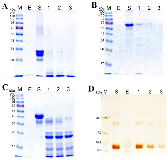 Degradation of the casein sodium salt (A), BSA (B), ovalbumin (C), and β-keratin (D) by the enzymatic extract from Bacillus sp. A5.3 depending on incubation time. M, protein molecular weight markers. E, enzymatic extract without a substrate; S, substrate. In (A): lane 1, 15 s; lane 2, 30 s; and lane 3, 60 s. In (B): lane 1, 5 min; lane 2, 15 min; and lane 3, 60 min. In (C): lane 1, 1 min; lane 2, 5 min; and lane 3, 15 min. In (D): lane 1, 30 min; lane 2, 60 min; and lane 3, 120 min.