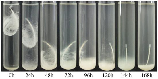 Our different strains showed dissimilar activity in terms of feather degradation. Treatment of a chicken feather with a culture of Bacillus sp. A5.3 for 7 days showed that the strain effectively degrades up to 70% of the feather and completely degrades it within 9 days (Figure 7). After 2 days, degradation of barbules was observed, and degradation of barbs started on the third day. The degradation of barbs continued throughout the incubation period and resulted in complete exposure of the shaft. The culture became milky.