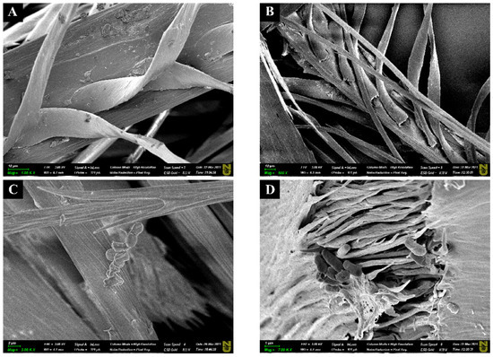 Scanning electron microscopy (SEM) images of chicken feather, where (A) is the intact feather, (B,D) show the feather after 48 h of incubation, and (C) is the feather after 144 h of incubation. Scale bars in (A–C), 10 μm; and in (D), 1 μm.