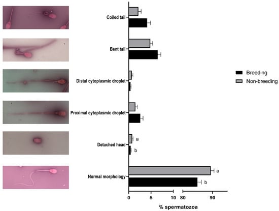 Seasonal differences in sperm morphology in Rasa Aragonesa rams. Results are shown as mean ± SEM of n = 56 (breeding season) and n = 40 (non-breeding season). Different letters indicate p < 0.05. Representative images of a normal spermatozoa and sperm abnormalities are also shown.