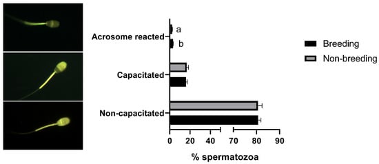 Seasonal differences in sperm capacitation state in Rasa Aragonesa rams. Results are shown as mean ± SEM of n = 56 (breeding season) and n = 40 (non-breeding season). Different letters indicate p < 0.05. Representative images of a non-capacitated, capacitated and acrosome-reacted spermatozoa are also shown.