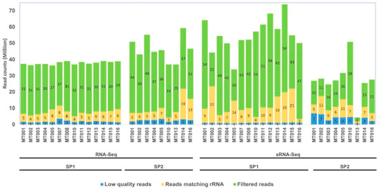 All raw fastq files were deposited in the Short Read Archive (SRA) database under the BioProject PRJNA752836. Post-sequencing, reads generated by RNA-Seq were filtered for low quality regions and sequencing adapters using Trim Galore [27]. The adapters were the specific forward (5′-AAGTCGGAGGCCAAGCGGTCTTAGGAAGACAA-3′) and reverse (5′-AAGTCGGATCGTAGCCATGTCGTTCTGTGAGCCAAGGAGTTG-3′) adapters for the SP1 samples; and Illumina TruSeq adapter (5′-AGATCGGAAGAGC-3′) for the SP2 samples. The sRNA dataset provided by SP1 was already filtered for low quality sequences and adapters using SOAPnuke [28]. We performed an additional filtering step for low quality regions using Fastp [29]. The sRNA reads provided by SP2 were clipped for Illumina adapters and low quality regions using Fastp. FastQC was used to check the quality of reads prior to and after quality filtering (≥Q30) for both RNA-Seq and sRNA-Seq samples [30]. The amount of rRNA was assessed by aligning the reads with Bowtie [31] against the Silva database (https://www.arb-silva.de, accessed on 9 January 2021).