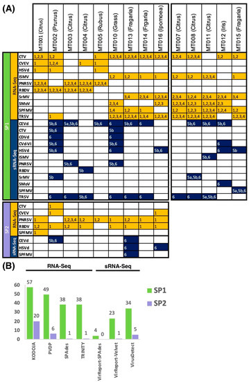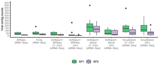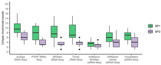 In contrast to RNA-Seq, sRNA-Seq datasets generated a few dozen to several thousand scaffolds. The size of the assembly was highly dependent on the sequencing technology, the method, and assembler used. The assemblies contained significantly more contigs in the samples from SP1 than from SP2 (p < 0.001), and both Virus Detect and VirReport-Velvet generated more contigs than VirReport-SPAdes (Supplementary Materials Table S4A). After performing homology searches against the non-redundant NT database, we only retained contigs with sequence similarity to viruses and viroids. We recovered twice as many viral contigs in the SP1 samples compared to the SP2 samples across sequencing platforms and bioinformatics tools tested. For the RNA-Seq samples, the number of viral contigs recovered by RNA-Seq was on par between SPAdes and Trinity. However, in the sRNA-Seq samples, the assemblies derived using either VirusDetect or VirReport-Velvet contained more contigs than derived using VirReport-SPAdes (Figure 2 and Supplementary Materials Table S4B).