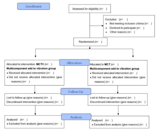 The following is a methodological type study to create a protocol and carry out a randomized and controlled clinical trial. It was divided into 2 stages: (1) Development of a protocol for WBV combined with MCT, following the Guidelines of the American College of Sports Medicine (ACSM) [] for elderly women with OST with a history of falls. The protocol was developed following the recommendations of the SPIRIT statement; (2) proposal of a randomized controlled clinical trial following the norms of the Consolidated Standards of Reporting Trials (CONSORT).