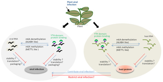 Schematic overview of virus-induced regulation of m6A methylation. When viral RNAs invade into plant cells, the m6A RNA methylase, demethylase and YTH domain proteins will modify the viral RNA. This might directly affect viral RNA stability, translation, and viral particle packaging. Alternatively, viral infection indirectly influences the expression level of host antiviral proteins, which could contribute or restrict viral infection.