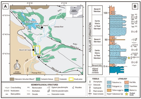 (A). Local geology of surroundings of Becerril del Carpio and study area, Campóo Group sediments highlighted. Modified from Diéguez et al. [] and Pujalte et al. []. (B). Synthetized stratigraphic section from lower part of Aguilar Fm. in the Becerril del Carpio section. Ls.: Limestones, Cgl.: Conglomerates, Mds.: Mudstones. Modified from Hernández et al. [].