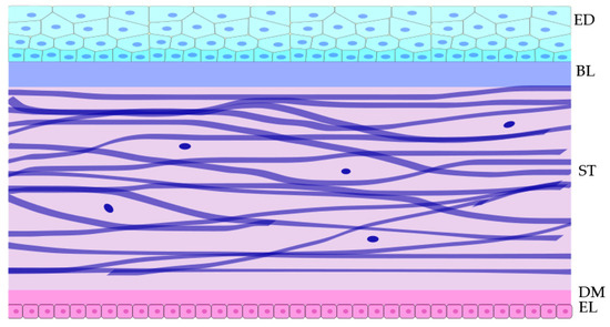 Schematic cross-section of the tissue layers within the central cornea and the approximate shape of cell within the layers. The top cyan layer is the epithelium,;below it is the acellular Bowman layer. Below that in violet are the fibroblasts within the stroma. Below the stroma is the acellular Descemet’s membrane to which the monolayer of pink endothelial cells adhere. Epithelial (ED), Bowman layer (BL), Stroma (ST), Descemet’s membrane (DM), and Endothelial layer (EL).