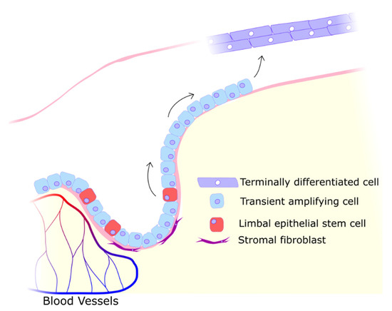The corneal epithelium covers the anterior portion of the cornea; it is composed of five to six layers of stratified, noncornified, squamous cells. The epithelium’s basal layer of cuboidal cells adheres to the Bowman layer via a basement membrane [6]. The main purpose of the corneal epithelium is to form a high turnover barrier to the outside. Along with this protective role, the epithelium also produces cytokines that influence the behaviour of neighbouring cell types, such as keratocytes [7]. The smaller basal cells are progenitor cells that replenish the continuously depleted upper layers. The basal progenitors themselves are a population maintained by, and descended from, limbal epithelial stem cells [1]. Inside the limbus are radially oriented fibrous folds called the palisades of Vogt; the limbal stem cells reside within these ridges [8]. As the limbus acts as the interface between the vascularized conjunctiva and avascular cornea, the palisades themselves are partially vascularized. The vasculature is responsible for providing nutrition and oxygen to the limbal area [9]. It is currently thought that the limbus and its inhabiting cells maintain the border between the two different tissues, and that any damage to the limbus may enable an invasion of conjunctival cells into the cornea. This typically leads to vascularization and a loss in vision quality [10,11,12]. These disturbances may occur following UV damage where the limbal stem cells no longer maintain the border [13,14,15,16]. Although the role of epithelial factors in the maintenance of angiogenic and lymphangiogenic privilege seems evident, the role of the limbus as a physical barrier to vascular invasion seems poorly supported [17,18].