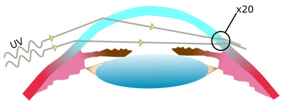 UV light entering the cornea laterally at the temporal side of the cornea, becoming focused at the nasal side of the cornea. The increase in UV exposure at the nasal side is estimated to be of up to twenty times the exposure on the temporal side.