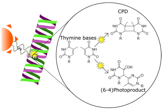 UV irradiation damages cellular DNA by causing the formation of cyclobutane pyrimidine dimers (CPDs) and pyrimidine (6-4) pyrimidone photoproducts (6-4PPs) (see Figure 4) [77]. CPD and 6-4PP lesions are both results of neighbouring pyrimidine covalently binding to each other [78,79,80]. CPDs are the most frequent UV lesions and—when cells fail to induce cell death through the activation of the DNA damage response—lead to mutations that in turn promote malignancy [81,82,83]. Mutations amid CPDs are responsible for transition mutations via Cytosine and Thymine nucleotide dimerization [84,85]. Importantly, CPD lesions are estimated to occur three times as frequently as 6-4PP lesions, and, due to their greater steric aberration in the DNA, 6-4PPs, they are more effectively recognized and thus repaired by NER than CPD lesions [86]. The first DNA repair enzymes that were discovered were CPD- and 6-4PP-photolyases, which specifically bind to either a CPD or a 6-4PP, respectively. These cryptochrome enzymes absorb visible (blue) light as energy source for electron transfer to mend the lesions [87,88,89]. In the Sphingomonas Antarctic bacterium a photolyase capable of binding to both CPD and 6-4PP called UV9 was identified [90,91].