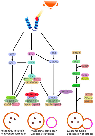 Autophagy is a degradation mechanism that utilises the lysosome to remove proteins from the cell. This is done either as part of the natural turnover of proteins or as part of a stress response. The process is mediated by several regulators that transport the targeted proteins and control the rate at which the proteins are removed. This rate can be adjusted by several stimuli to remove damaged proteins. One of these stimuli is UV irradiation. Ataxia-telangiectasia mutated (ATM) and Rad3-related (ATR) are both damage sensors that can mediate the activation of p53 via checkpoint kinase 1 (CHK1) and checkpoint kinase 2 (CHK2). ATR may also activate the STK11/AMPK metabolic pathway to stimulate the tuberous sclerosis 2 (TSC2) tumor suppressor and regulate autophagy via Beclin 1 [130,131]. TSC1 and TSC2 may also downregulate mTOR activity [132]. The difference between ATM and ATR is that the former is an ATM-Chk2 pathway mostly activated by double-strand breaks, while the latter ATR/Chk1 is activated by single-strand breaks [133,134]. Both ATR and ATM inactivate mTORC1, enabling autophagy as a result [135].