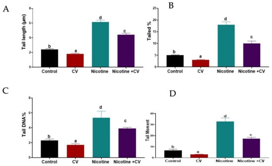 Effect of the oral administration of nicotine (100 µg/mL/kg bw), CV (100 mg/kg BW), or both for 40 days on the comet parameters in the brain tissue of female Swiss mice. (A): Tail length; (B): Tailed %; (C): Tail DNA %; (D): Tail moment; Data expressed as mean ± SE, n = 10 for each group. Each bar carrying different letters (a, b, c, and d) was significantly different at p < 0.001.