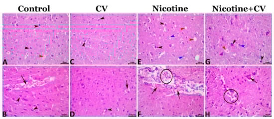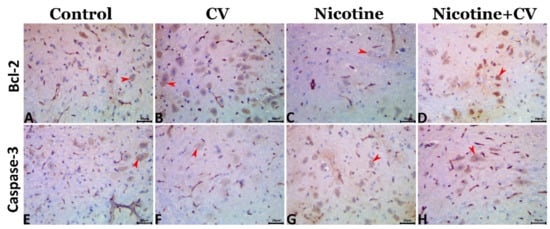 Representative photomicrograph of the cerebral tissue sections showing the immunoexpression of Bcl-2 (red arrowheads) in the control (A), CV (B), nicotine-treated (C), and nicotine + CV-treated (D) and the immunoexpression of the caspase 3 (red arrowheads) in the in the control (E), CV (F), nicotine-treated (G), and nicotine + CV-treated mice (H). Scale bar (30 μm).