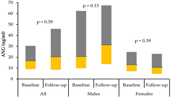 Box-plot representing the median (Q1 and Q3) levels of ANG (ng/mL) for all subjects, males and females.