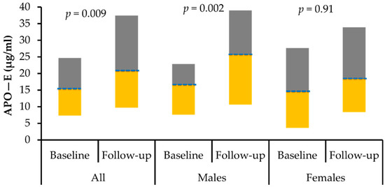 Post-intervention differences according to gender was presented in Table 2. No statistically significant differences were observed in glucose, total cholesterol, HDL-cholesterol, and other clinical characteristics between the males and females at baseline. Males had significantly higher waist–hip ratio and vitamin D levels at baseline compared to females (p-values < 0.001 and 0.006, respectively). Moreover, apolipoproteins AII and CII levels were higher in males compared to females at baseline. In both genders, post-intervention 25(OH)D levels significantly increased as expected (p < 0.001 for both). Parallel to this, in males, a significant increase in apolipoproteins CII, CIII, and E was observed (p-values of 0.02, <0.001, and 0.002 respectively), and in females, a statistically significant decrease in apolipoprotein B was observed (p = 0.02). Apo-E in males at baseline were 15.9 (7.5–23.3) and after six months’ supplementation with vitamin D increased significantly to 25.6 (10.5–39.4) (p = 0.002). In females, apo-E increased at follow up to 16.6 (2.8–29.0) from 13.8 (2.8–27.5) (p = 0.91) at baseline. There was no statistically significant difference in the levels of circulating ANG post intervention in both genders.