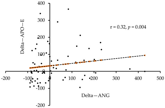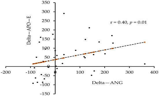 Association between delta change values post intervention in ANG and apo-E in all subjects.