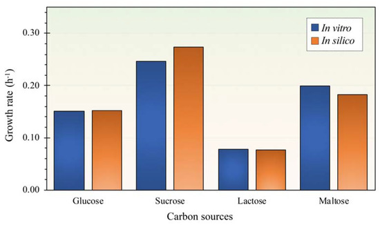 Model validation by comparison of growth rate (h−1) between in silico data and in vitro data across different carbon sources.