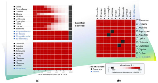 Stimulating growth of lactic acid bacteria including L. reuteri was relied on the complex, semi-defined nutrients including vitamins and amino acids. Nevertheless, the specific preferable nutrients for KUB-AC5 growth remain unclear. Therefore, we used iTN656 to investigate how the individual nutrients and their variations contributing to L. reuteri KUB-AC5 growth through single omission analysis. Interestingly, this analysis enabled the identification of the 14 potential nutrients that could be essential for growth of L. reuteri KUB-AC5 as shown in Figure 4a. These included the four vitamins (i.e., B3 (nicotinate), B5 (pantothenate), B6 (pyridoxamine), and B7 (biotin)) and the 10 amino acids (i.e., alanine, serine, leucine, isoleucine, phenylalanine, valine, tyrosine, histidine, methionine, and tryptophan). In contrast, there remained 11 non-essential nutrients for growth which were vitamin B1 (thiamin), cysteine, proline, threonine, arginine, lysine, glycine, asparagine, aspartate, glutamine, and glutamate.