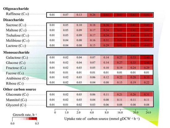The predicted growth behaviors of L. reuteri KUB-AC5 grown under the different carbon sources. In addition to the color scale, the individual values contained in a matrix also represent the prediction growth rates governed under the different uptake rates of the different carbon sources.