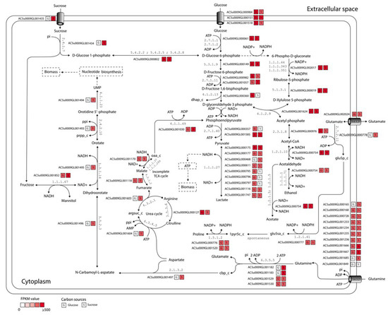 As in silico and in vitro growth rates observed under sucrose utilization were found to be favorable for L. reuteri KUB-AC5, compared to the other disaccharides and monosaccharides. Therefore, we performed the integrative transcriptome analysis using the iTN656 model as a scaffold. Considering these reporter metabolites in context of expression patterns, we clearly observed the higher transcriptional changes in a form of FPKM values occurred in sucrose than glucose as illustrated in Figure 6. Interestingly, the presence of sucrose in the culture medium induced the upregulation of genes encoding sucrose transporter and sucrose phosphorylase (EC: 2.4.1.7). Moreover, the reduction of fructose to mannitol catalyzed by mannitol dehydrogenase (EC: 1.1.1.67) was selectively upregulated upon sucrose supply. This reaction was suggested to be an alternative pathway instead of lactate formation to regenerate nicotinamide adenine dinucleotide (NAD+) [40]. In addition to the sugar uptake, several metabolic pathways related to biomass precursor production, including nucleotide biosynthesis, urea cycle, and the uptake transporters of glutamine were highly expressed. Interestingly, the expression of glutamine transporter could supply more glutamate formation via carbamoyl-phosphate synthase (EC: 6.3.5.5), which the product carbamoyl phosphate is an intermediate in the biosynthesis of nucleotides through orotate pathway [41]. This implied that glutamate might be a key role for L. reuteri KUB-AC5 growth [14]. For example, glutamate was found to be the preferential precursor for proline biosynthesis through the catalytic activities of glutamate 5-kinase (EC: 2.7.2.11), glutamate-5-semialdehyde dehydrogenase (EC: 1.2.1.41), and pyrroline-5-carboxylate reductase (EC: 1.5.1.2). We observed that the genes encoding these reactions were also upregulated when sucrose was used as a sole carbon source. Moreover, the conversion of pyruvate to lactate by lactate dehydrogenase (EC: 1.1.1.27) was selectively downregulated upon sucrose supply, while the conversion of N(omega)-(L-Arginino)succinate to fumarate via urea cycle by argininosuccinate lyase (EC: 4.3.2.1) was simultaneously upregulated. The integrative transcriptome analysis clearly suggests that sucrose predisposes L. reuteri KUB-AC5 for high biomass production.