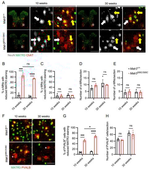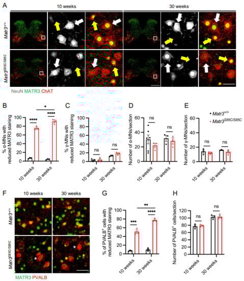 MATR3 loss in α-motor neurons and interneurons in the cervical spinal cord of Matr3S85C/S85C mice. (A) Representative images of 10 and 30 weeks cervical spinal cord staining for α-motor neurons (ChAT+, NeuN+, denoted by white arrows) and γ-motor neurons (ChAT+, NeuN−, denoted by yellow arrows). Scale bar for the spinal cord image denotes 500 μm and the zoomed-in image denotes 50 µm. Quantification of the percentage of motor neurons with reduced MATR3 staining in (B) α-motor neurons (10 weeks: n = 3 Matr3+/+, 3 Matr3S85C/S85C; 30 weeks: n = 3 Matr3+/+, 3 Matr3S85C/S85C) and (C) γ-motor neurons (10 weeks: n = 3 Matr3+/+, 3 Matr3S85C/S85C; 30 weeks: n = 3 Matr3+/+, 3 Matr3S85C/S85C). Quantification of the number of (D) α-motor neurons (10 weeks: n = 6 Matr3+/+, 3 Matr3S85C/S85C; 30 weeks: n = 3 Matr3+/+, 3 Matr3S85C/S85C) and (E) γ-motor neurons (10 weeks: n = 3 Matr3+/+, 3 Matr3S85C/S85C; 30 weeks: n = 3 Matr3+/+, 3 Matr3S85C/S85C). (F) Representative images of 10 and 30 weeks PVALB+ interneurons in the cervical spinal cord. Interneurons with reduced MATR3 staining are denoted by a white asterisk. Scale bar denotes 50 µm. (G) Quantification of the percentage of PVALB+ interneurons with reduced MATR3 staining (10 weeks: n = 3 Matr3+/+, 3 Matr3S85C/S85C; 30 weeks: n = 3 Matr3+/+, 3 Matr3S85C/S85C). (H) Quantification of the number of PVALB+ interneurons (10 weeks: n = 3 Matr3+/+, 3 Matr3S85C/S85C; 30 weeks: n = 3 Matr3+/+, 3 Matr3S85C/S85C). Bar graph heights depict mean ± SEM, with each datapoint representing an animal. * p < 0.05, ** p < 0.01, *** p < 0.001, **** p < 0.0001, ns = not significant.