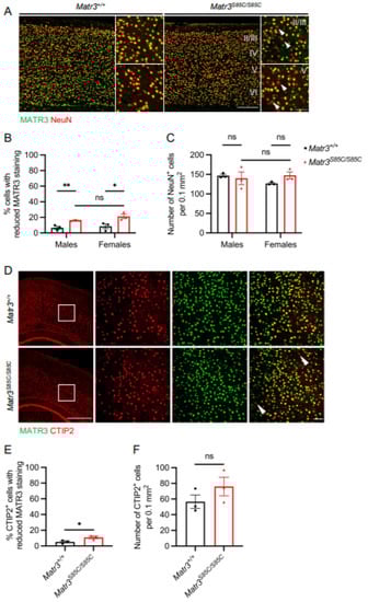 Given that the motor cortex is typically affected in ALS patients and mouse models [,], we investigated whether neurons in the brain cortex are affected in Matr3S85C/S85C mice using a NeuN antibody at disease end stage (60 weeks). Although there was no significant difference in the number of neurons in the cortex (Figure 3A,C), we found a small portion of neurons associated with reduced MATR3 staining in layers II/III and V in the cortex of the mutant mice (16.3% in males, 21.2% in females) (Figure 3A,B). To gain further insight into which specific neuronal types exhibit reduced MATR3 staining in layer V, where upper motor neurons reside, we conducted immunostaining at advanced disease stage (30 weeks) with MATR3 and CTIP2 antibodies, a marker of upper motor neurons []. We found a significant difference in the percentage of CTIP2+ cells with reduced MATR3 staining in the Matr3S85C/S85C mice (10.9% of cells) compared to the wildtype littermates (5.1% of cells) (Figure 3D,E); however, we did not find a significant loss of CTIP2+ cells in the mutant mice (Figure 3F). These results indicate that the S85C mutation affects a subset of upper motor neurons. However, the affected neuronal subtypes need to be identified and the functional consequences of MATR3 loss in these neurons need to be investigated.