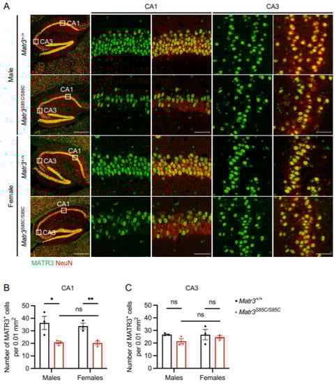 We have previously reported that aged Matr3S85C/S85C male mice, but not females, show memory loss using the conditioned fear test []. To follow up on the neuropathological basis of these findings, we examined the hippocampus, the critical region linked to memory, to investigate MATR3 loss and neurodegeneration in Matr3S85C/S85C male and female mice at 60 weeks. We found that MATR3 staining was significantly reduced in subsets of neurons residing in the cornu ammonis field 1 (CA1) region (Figure 4A,B), but not in the CA3 region (Figure 4A,C), in both males and females. These results suggest that the MATR3 S85C mutation affects subsets of CA1 neurons in both males and females but may not explain the sex differences in memory loss.