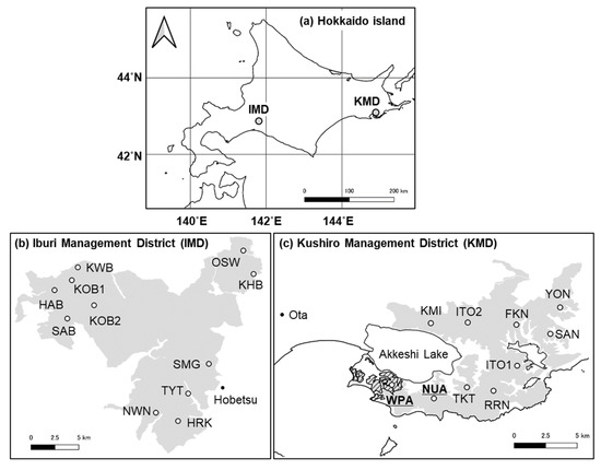 - Uno, H.; Ueno, M.; Inatomi, Y.; Osa, Y.; Akashi, N.; Unno, A.; Minamino, K. Estimation of population density for sika deer (Cervus nippon) using distance sampling in the forested habitats of Hokkaido, Japan. Mammal Study 2017, 42, 57–64. [Google Scholar] [CrossRef]