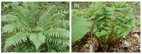 - Hirabayashi, H. Dryopteris crassirhizoma Nakai. In Illustrations of Pteridophytes of Japan; Kurata, S., Nakaike, T., Eds.; University of Tokyo Press: Tokyo, Japan, 1985; Volume 4, pp. 344–361. (In Japanese) [Google Scholar]