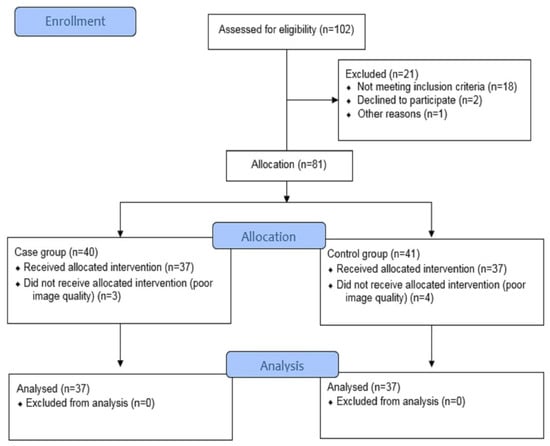 The patients with moderate-to-severe left ventricular hypertension, pericardial effusion, or poor quality of echocardiographic images for the evaluation of the endocardial border because of the patient’s poor echo window or tachypnea were excluded from the study. A total of 81 volunteers met the eligibility criteria for the study, 40 patients with SSc and 41 healthy volunteers, and were introduced to the echocardiography laboratory. Seventy-four volunteers were included in this study, as seven cases had poor image qualities and were excluded (Figure 1).