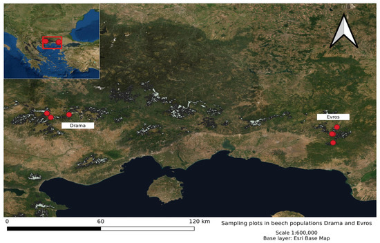 Map with the location of sampling plots in the beech populations Drama and Evros in NE Greece. Light-gray shading indicates the area covered by beech forests in Greece.