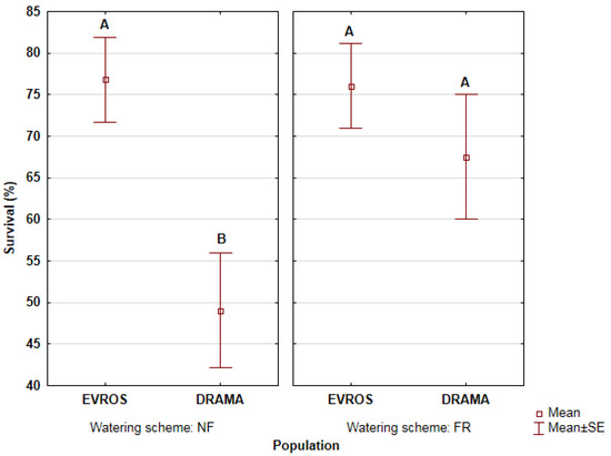 The percentage of survived seedlings differed between populations under non-frequent watering. Seedlings originating from Evros presented significantly higher survival than those from Drama (Figure 2). On the other hand, no significant differences between populations were observed under frequent watering.
