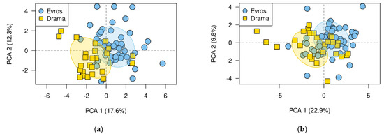 PCA plot of individuals, under (a) non-frequent and (b) frequent watering.