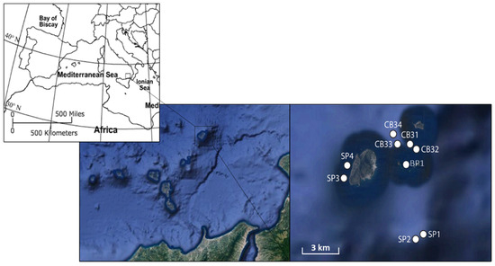 Figure 1. Study area and location of sampling sites within each sub-area. SP indicate samples collected at the Secca dei Pesci, CB3 indicated samples collected off the southwestern coast of the islet of Basiluzzo and BP is the Black Point site at the Archipelago of Dattilo, Panarelle, Lisca Bianca, Bottaro and Lisca Nera (Color maps are generated from Google Earth: Map data ©2021 Google Earth data SIO, NOAA, US Navy, NGA, GEBCO, Landsat/Copernicus).