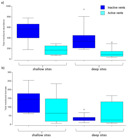 Figure 2. Boxplots of (a) abundance (N individuals/10 cm2) and (b) biomass (μgC/10 cm2) of meiofauna in active (shallow and deep) and inactive (shallow and deep) sites. Colors indicate active (light blue) and inactive (dark blue) vents and x-axis defines shallow vs. deep sites. Lines in the box represent the median. Circles are outliers (observation points that is distant from other observations).