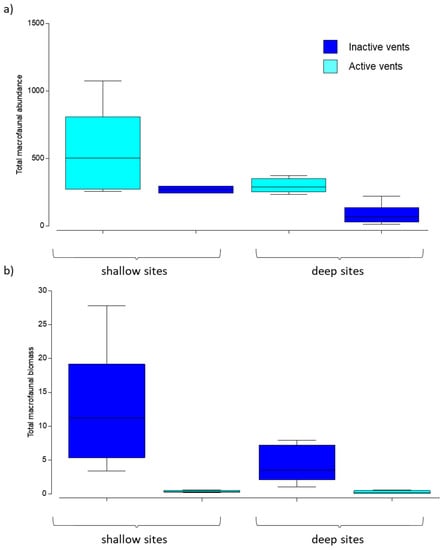 Figure 3. Boxplots of (a) abundance (N individuals/m2), and (b) biomass (g WW/m2) of macrofauna in in active (shallow and deep) and inactive (shallow and deep) sites. Colors indicate active (light blue) and inactive (dark blue) vents and x-axis defines shallow vs. deep sites. Lines in the box represent the median.