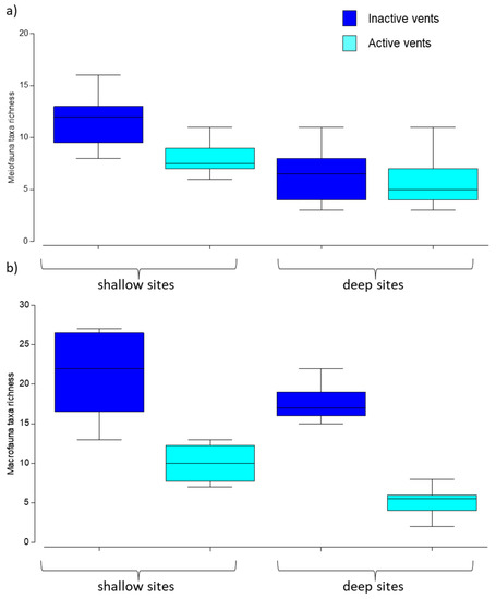 Figure 4. Boxplots of meiofaunal higher taxa richness (a) and macrofauna species richness (b) recorded in active (shallow and deep) and inactive (shallow and deep) sites. Colors indicate active (light blue) and inactive (dark blue) vents and x-axis defines shallow vs. deep sites. Lines in the box represent the median.