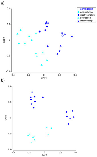 The CAP analysis revealed a good separation of meiofaunal assemblages at inactive vs. active vents (Figure 5a), while a clear segregation of samples also by depth occurred for macrofauna, especially for samples collected at inactive vents (Figure 5b).
