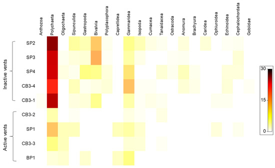 A shade plot (Figure 6) based on the abundance of the macrofaunal classes/orders found at each station shows a decrease in polychaetes and disappearance of mollusks, sipunculids, crustaceans (except for gammarids and caprellids), echinoderms, and chordates at active vents.