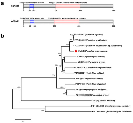 Domain structures and phylogenetic analysis. (a) Protein domains of FgAtrR and AfAtrR found in the Pfam database are shown. (b) The phylogenetic tree based on the amino acid sequence was constructed by the MEGA-X program using the neighboring-join method. The amino acid sequences from different species (shown in brackets) were aligned by MUSCLE.