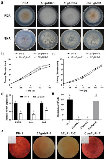 To determine the function of FgAtrR in F. graminearum, we constructed the FgAtrR deletion mutant (ΔFgAtrR) strain by a homologous recombination strategy. Two transformants, ΔFgAtrR-1 and ΔFgAtrR-2, which were confirmed by Southern blotting analysis (Figure S1), were used for further investigations. When the F. graminearum PH-1, ΔFgAtrR mutant, and ComFgAtrR were cultured on PDA agar plates for 96 h, the two mutants showed radial growth of 8.00 ± 0.07 cm and 7.88 ± 0.09 cm after 4 days at 25 °C. In contrast, wild-type and ComFgAtrR measured 7.21 ± 0.02 cm and 7.13 ± 0.08 cm, respectively. Namely, ΔFgAtrR grew approximately 10% faster than the wild-type PH-1 and ComFgAtrR strains (Figure 2a,b and Figure S3a). When these strains were grown on the low-nutrient SNA plates, a similar observation was obtained, indicating that FgAtrR might act as a negative regulator of the radial growth of F. graminearum (Figure 2a,c and Figure S3b). Moreover, the wild-type strain PH-1 and complemented strain ComFgAtrR could produce red pigments on PDA plates or in PDB medium, while ΔFgAtrR produced much less pigment and showed a white colony phenotype (Figure 2a and Figure S4). In order to explain this, a qRT-PCR assay was carried out to measure the expressions of key pigment-synthesis-related genes. The results indicated that the relative expression of PKS12, AurJ, and AurF in ΔFgAtrR was significantly decreased compared to wild-type PH-1 (Figure 2d).