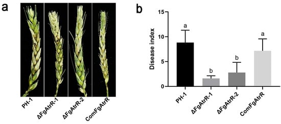 Since F. graminearum is an important plant pathogen, we tested whether FgAtrR is involved in the pathogenicity of F. graminearum. The virulence assays were performed using flowering wheat heads and corn silks. It was found that the deletion mutant only infected 1–5 grains around the inoculation point, while the wild-type strain could infect 7–13 grains (Figure 3a,b). This indicated that the deletion of FgAtrR significantly impaired the virulence of F. graminearum. Similar results were also obtained in the corn silk assays. No obvious change in color was observed when silks were inoculated with the ΔFgAtrR strain compared to those inoculated with PH-1 strain or ComFgAtrR strain (Figure S5). The results above revealed that FgAtrR is crucial for full virulence in F. graminearum.