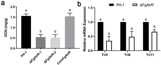 DON is a critical virulence factor for the pathogenicity of F. graminearum. Therefore, we assessed the DON production of the F. graminearum PH-1, ΔFgAtrR, and ComFgAtrR in TBI medium. The wild-type strain PH-1 and complemented strain ComFgAtrR produced 1.56 ± 0.09 and 1.54 ± 0.16 mg/g mycelia after incubation for 7 days, respectively. In comparison, the two deletion mutants could only produce 0.54 ± 0.12 and 0.52 ± 0.15 mg/g of mycelia, which decreased by approximately 70% of DON production in the wild type (Figure 4a). The expression levels of several genes responsible for DON biosynthesis were also determined by qRT-PCR. The results showed that the transcription levels of TRI5, TRI6, and TRI11 were significantly downregulated in the ΔFgAtrR mutant compared with those in the wild-type strain PH-1. These results suggested that FgAtrR modulates DON biosynthesis by regulating the expression of TRI genes in F. graminearum (Figure 4b).